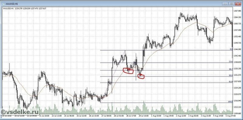 2Уровень 38.2%. Гораздо более сильный. Здесь имеет смысл открывать свои первые позиции или же докупаться. Рынок с высокой долей вероятностей как минимум потопчется на этом значении и пойдет снова по тренду.