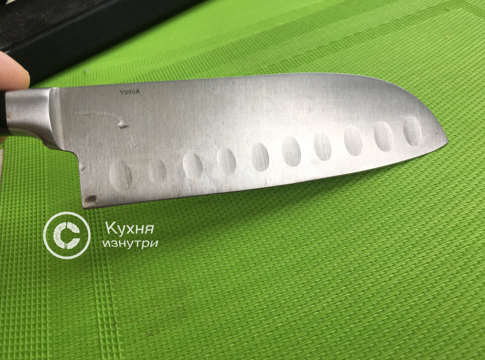 Вот почему ножи японской формы Сантоку(тот. что на фотографиях) очень тоненькие. Однако этот факт создает другую проблему. Тонкие слайсы продукта прилипают к ножу. Особенно это заметно при нарезке картофеля. Между продуктом и ножом возникает вакуум, который плотно притягивает их друг к другу. Чтобы исключить этот вакуум и придумали насечки и дырочки.