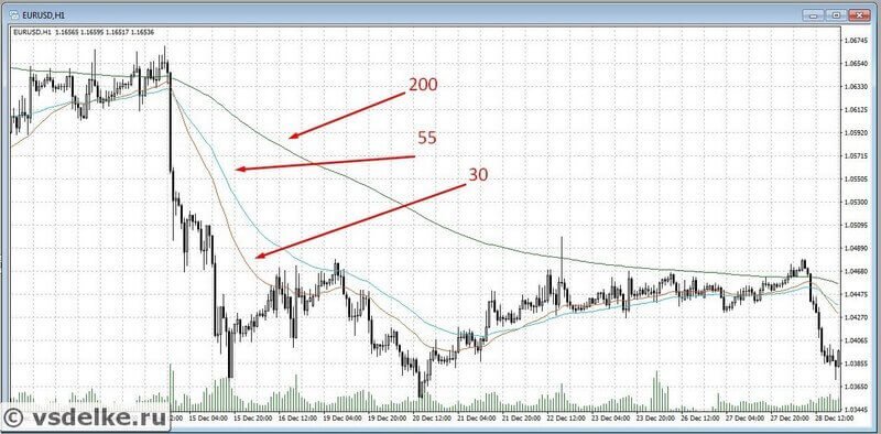 Для усиления сигнала на вход существует стратегия пересечения трёх скользящих средних. Она позволяет отсеивать много шума на рынке, но за это придётся платить тем, что начало тренда мы немного пропустим.