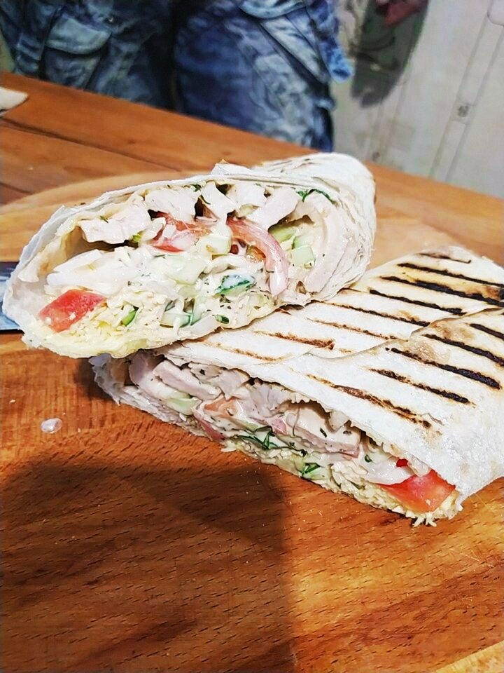 Куриная грудка - 600 гр Капуста - 100 гр Майонез, сметана,кетчуп - по 3 ст л помидоры и огурцы -по 250 гр Лук салатный 2 шт Сыр - 100 гр Лаваш - 3 шт соль ,специи для маринада - по вкусу ( у нас паприка и сушеный чеснок ) Уксус яблочный 6 % - 1 ч л Зелень по вкусу Маринуем курицу на 5-6 часов . По истечению этого времени начинаем подготавливать остальные продукты . Первым делом займемся луком. его нужно нарезать полукольцами , залить кипятком и добавляем 1 ч.л. яблочного уксуса . Слить воду нужно через 3-5 минут. Далее помидор нарезаем дольками , огурцы и капусту - соломкой , зелень мелко. Сыр натираем на мелкой терке . Теперь нам необходимо обжарить курицу . Мы используем для этого чугунную сковороду гриль(можно использовать и обыкновенную сковородку) Смазываем ее небольшим количеством растительного масла . грудку нужно обжаривать с каждой стороны примерно по 3 минуты . Когда грудка будет готова снимаем ее и даем отдохнуть минут 5 . В это время займемся приготовлением соуса, смешаем
