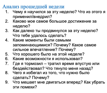 На нашу жизнь влияет не то, что мы сделали однажды, а то что мы делаем регулярно, каждый день и каждую неделю. Поделюсь тем, что я делаю каждую неделю, чтобы быть более продуктивным и жить наполненную жизнь. 1. Главная привычка – Еженедельный ритуал: Каждый выходной я письменно отвечаю на вопросы ниже. С этого начинается мой еженедельный ритуал. Сначала анализ прошедшей недели, потом план следующей недели. На это уходит 1-2 часа, в тихом спокойном месте. Благодаря вопросу 7, я удалил приложение Instagram, теперь я могу в него зайти только через браузер, либо с компа. Также я понял, что часто трачу время на бесполезные переживания. Когда я это заметил, я стал спокойнее реагировать на внешние ситуации. Дальше я делаю обзор своей системы в OneNote. Я просто смотрю те проекты, которыми сейчас занимаюсь и уделяю каждому внимание. Этому научился из книги GTD Дэвида Аллена. Про GTD писал тут. В обзор входит: просмотр календаря, разбор заметок за эту неделю, обзор проектов, планирование по ка