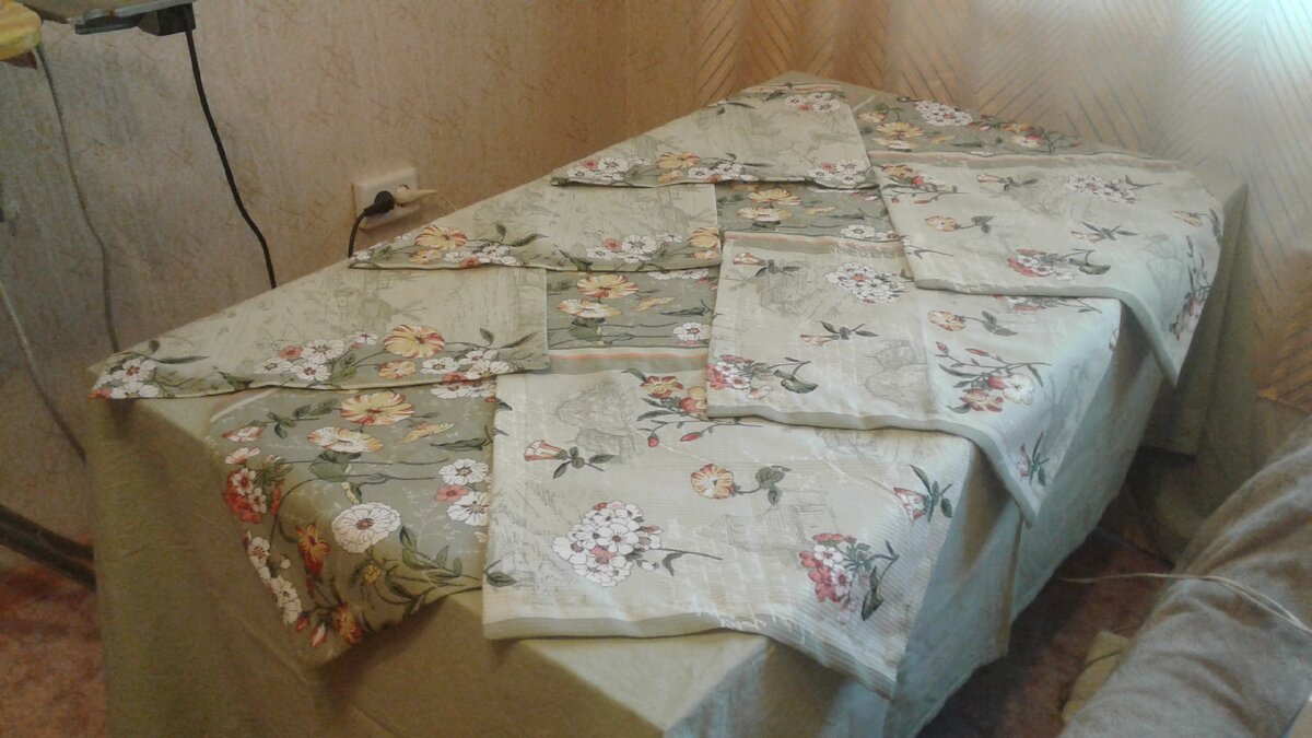 Долгое время я вообще не представляла, для чего нужны тканевые салфетки и, тем более, как их шить. Когда моя дочь готовилась к свадьбе, она сделала мне заказ – сшить 30 белых салфеток. Я купила белую бязь, а потом уже стала читать, как их шить. В итоге салфетки свадьбу, конечно, украсили, но получились маленькие, а ткань оказалась мнущейся и плохо отстирывающейся. Тем не менее, я использовала их для семейных торжеств. А тут, на самоизоляции, захотелось чего-то большего -полноразмерных цветных салфеток в комплекте с дорожкой на стол. Я пошла в магазин и выбрала вафельную ткань шириной 1,5 метра с рисунком, идущим в три полосы - середина более темная, чем края. Купила полтора метра, что обошлось мне в 240 рублей. Обрезала кромки и разделила ткань на три одинаковых полосы, из крайних скроила 6 салфеток размером 50Х50, а из середины - дорожку. На подгиб салфеток уходит по 4 см с каждой стороны - 1 см на первый подворот и 3 см второй, таким образом, салфетки получились 41Х42 см. Думаю,