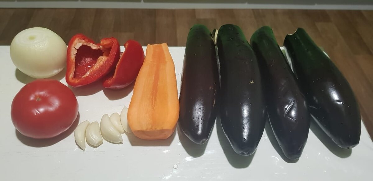 Основная тонкость приготовления этих овощей в способе их нарезки и тушении при закрытой крышке. Нам понадобятся: баклажаны, морковь, болгарский перец, лук, помидор, чеснок, растительное масло, соль. Так как овощи - очень насыщенное сочное блюдо, к ним подала обыкновенную отварную куриную грудку и немного свежего огурца. Вот такое полезное и вкусное блюдо я приготовила сегодня. Кушать подано. Приятного аппетита!