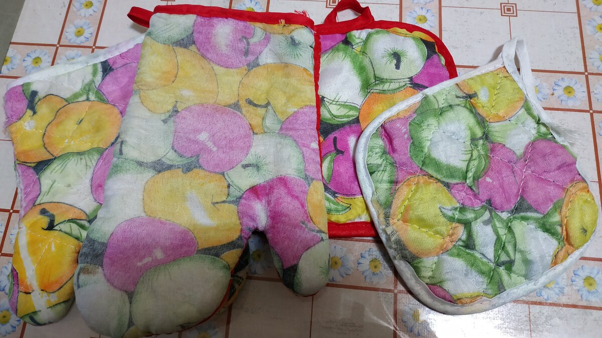 Получилось две пары рукавиц разного размера. Большие, на мужскую руку и поменьше, для нас "девчонок". Хоть ткань двухсторонняя, стёганная, на синтепоне, но в места ладоней я всегда прокладываю дополнительный слой или того же отреза или просто ватина. Это, чтобы можно было без боязни браться за очень горячую посуду.