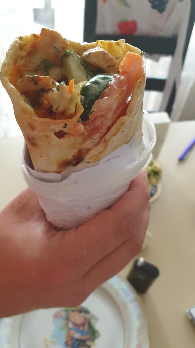 Именно та самая в пите! В условиях карантина, вспоминается как идешь где нибудь по Садовой и этот запах так и манит. Так что мешает повторить? Готовим курочку: Перемешиваем и оставляем в холодильнике, примерно 20-30 минут. Пока нарезаем овощи соломкой и готовим соус, лучше поменьше. Фирменый соус: Сразу скажу, в шавермах замешивают на растительном масле, но я себя люблю и заменяю кефиром. Замешиваем в густую консистенцию, чтобы тянулся с ложки. Пита: Греем в микроволновке 15 сек, так легче резать и разделяем половинки. Собираем шаверму: Курицу в разогретую сковородку, не часто перемешиваем. Кладем питу на сковородку, все складываем и поливаем соусом. Буквально 3 минутки, чтобы прижарилось. Дальше надо действовать быстро: Лопаткой переносим на подготовленый лист бумаги а4. Поднимаем левый край за бумагу, тянем к правому, паралельно поджимая питу внизу внутрь. Все проще, чем кажется, главное низ вжать хорошо, чтоб не капал соус. И вуаля... Всем приятного...поставьте лайк, я старался.