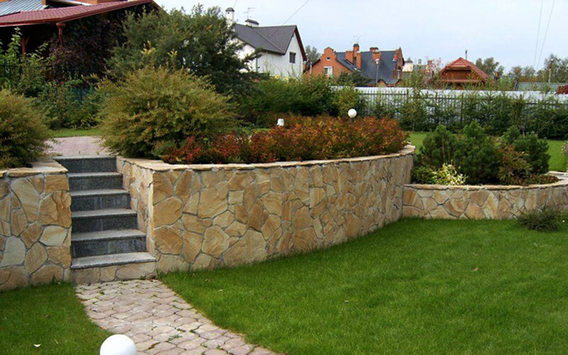 Подпорная стенка из природного камня, уложенного на цементный раствор, тоже представляет собой прочную конструкцию, да и смотрится очень естественно в дизайне любого участка, так как прекрасно сочетается с растительностью.