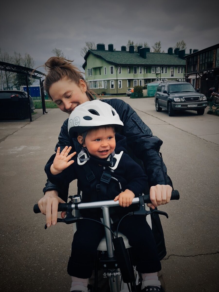 Велокресло мы выбрали Bobike mini. Оно именно для детей до 15 кг и для установки впереди. Шлем дочери той же марки. Я переживала, что она пошлёт нас с этим шлемом к чертовой бабушке, но обошлось. Наоборот, понимает: раз шлем надевают, значит приключения нас ждут.