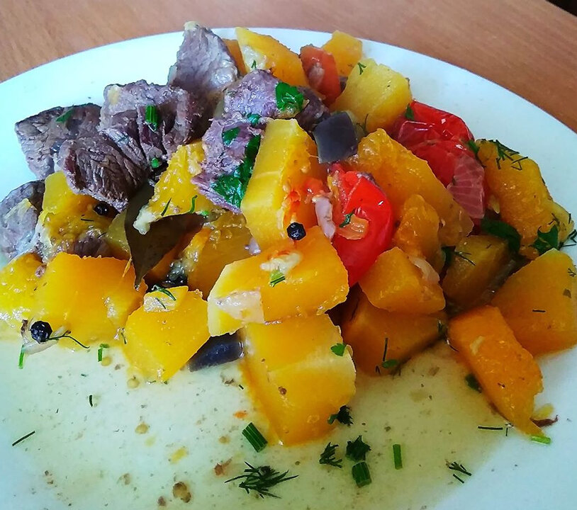✅ Зелень. Телятину слегка (!) обжарить, выложить в сотейник, залить водой со специями. Тушить 30 минут. Добавить тыкву, лук, перец болгарский, помидоры. Посолить. Тушить ещё 30 минут. Подавать с зеленью. Приятного всем аппетита! Больше общения и рецептов - в группе "Рецепты для диабетиков" в Facebook, или в группе ВКонтакте! Рецепт на странице в Facebook Автор рецепта - Оксана Щеголькова