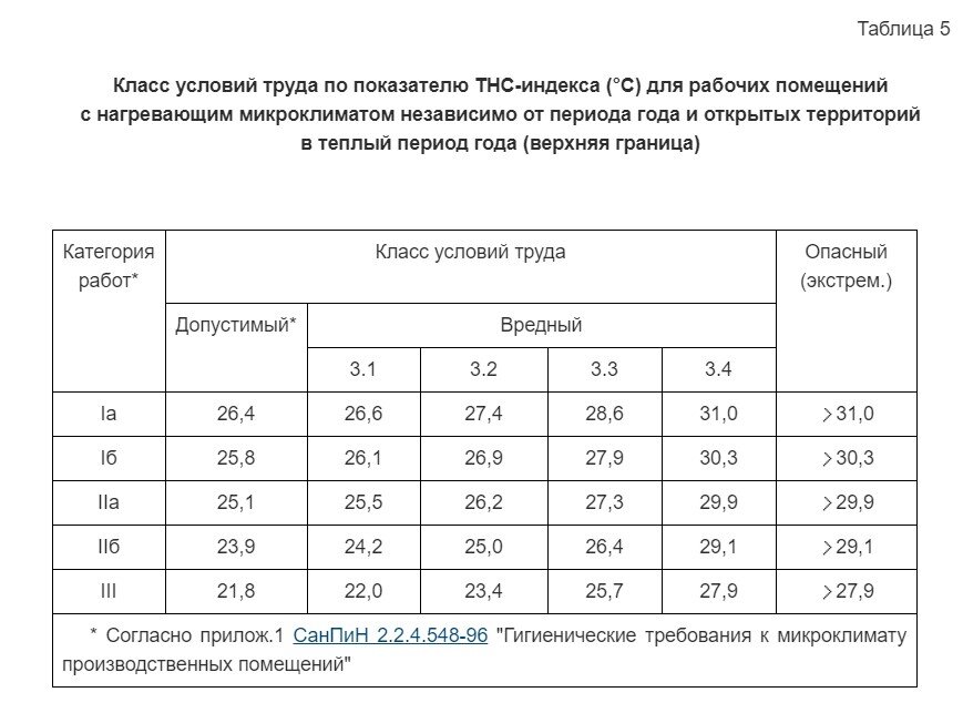 Для открытых территорий в теплый период года и температуре воздуха 25 °С и ниже микроклимат оценивается как допустимый (2 класс). Если температура превышает эту величину, класс условий труда устанавливают по ТНС-индексу (табл.5), который рекомендуется определять в полдень при отсутствии облачности.