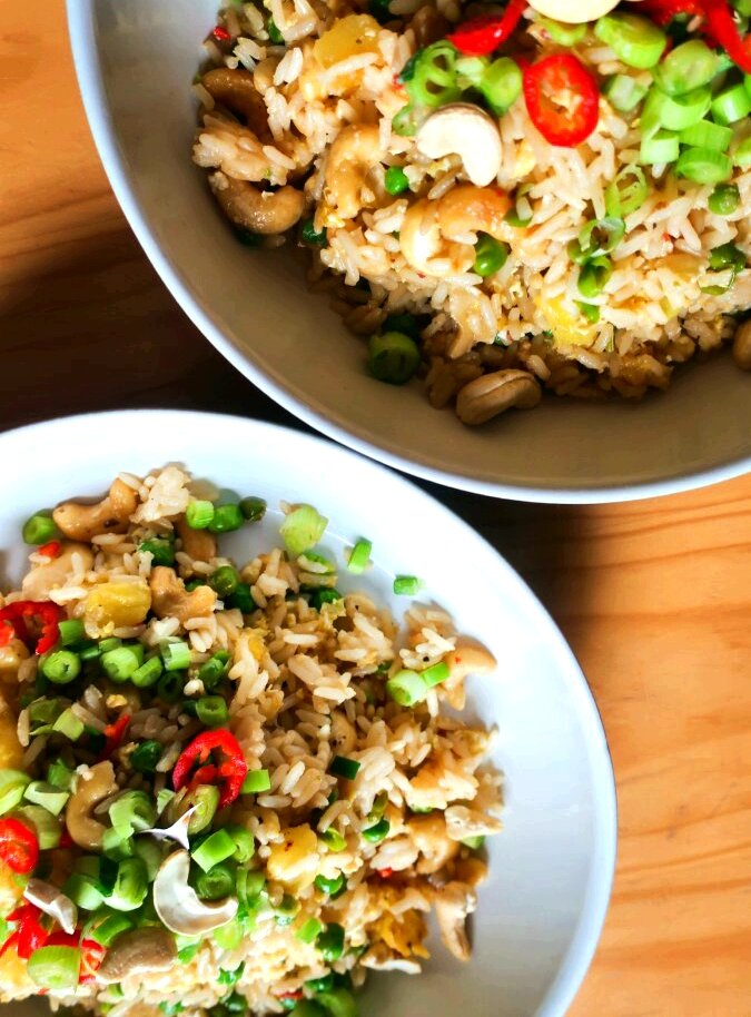 Моя местная китайская еда на вынос делает абсолютно хрустящий жареный рис с ананасами и кешью (могу подтвердить, что это 10/10, когда в паре с маленькой курицей кунг по и, может быть, с некоторыми хрустящими морскими водорослями), поэтому я подумала, что попытаюсь сделать это из дома, чтобы спасти немного денег. Мой парень готовил овощной жареный рис каждую неделю с того дня, как я переехал к нему в 2014 году, поэтому я решил, что просто адаптирую его рецепт и послушаю, что вы знаете, это сработало! Я люблю ананасы и орехи в рисовом блюде, но понимаю, что это, вероятно, немного похоже на ананас в пицце, и не всем по вкусу. Этот рецепт очень легко изменить - вы можете добавить курицу, вы можете удалить яйцо и сделать его веганским, или вы можете добавить несколько разных овощей, чтобы они соответствовали вашему вкусу. И, что самое приятное, это займет всего 10 минут Наслаждайтесь! Что нужно:большая миска риса, овощей, кешью и ананаса. Подходит для: супер быстрый ужин в будний день. Ка