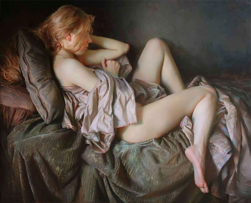«Меня соблазнил очаровательный женский портрет Сержа Маршенникова« Кровать в пиратском стиле ». Маршенников использует томную позу своей модели, тонкие кружева, накинутые на ее бедро, и глубокие складки пышных простыней, утешителей, теплых подушек, чтобы передать чувственность, женственность и обещание бесконечного удовольствия, которое приходит с пробуждением каждое утро с оригинальные произведения изящного искусства », Томас Холл, художественная критика, Флорида.