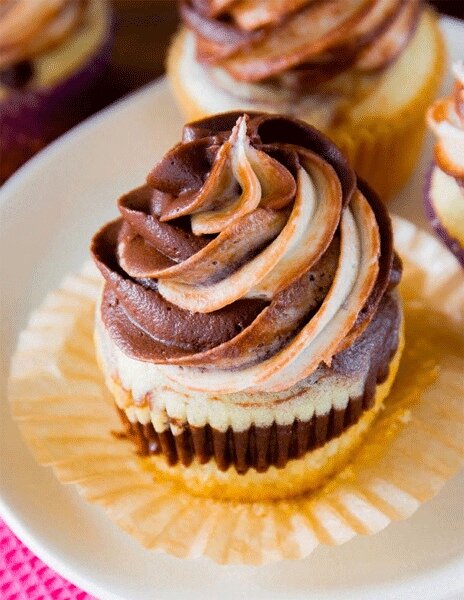 Ингредиенты: Для кексов: 130 гр. муки 15 гр. какао порошка 5 гр. разрыхлителя 1 гр. соли 100 гр. сахара 135 гр. сметаны 30 гр. сливочного масла 50 гр. яиц Для шоколадного ганаша: 50 гр. черного шоколада (70%) 75 гр. сливок (30-35 % жирности) Для мраморного крема: 200 гр. сгущенного молока 200 гр. сливочного масла Приготовление: 2. Соединить муку с солью и разрыхлителем. 3. Растопить сливочное масло. 4. В отдельной миске смешать сметану и сахар, добавить растопленное масло и яйцо, вымешивать до однородности. Всыпать мучную смесь и размешать. Поделить тесто пополам: в одну половину добавить какао, размешать. 5. Выложить в каждую формочку ложку шоколадного теста, затем – ложку белого. Так разложить всё тесто по формочкам. Отправить в духовку и выпекать 20-25 минут. Вынуть из духовки готовые кексы, остудить и вынуть из формочек. 6. Приготовить ганаш: растопить шоколад и смешать с горячими сливками, чтобы вышла гладкая масса. 7. Сливочное масло для крема размягчить при комнатной температу