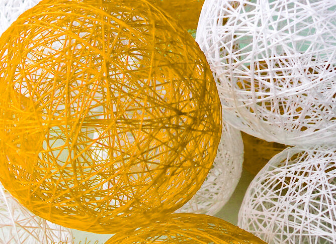 Из обычных ниток и клея можно сделать отличное украшение для интерьера. Они всегда смотрятся эффектно как подвески, элементы поделок, новогодние игрушки, вазы и даже люстры. Суть изготовления поделки-паутинки заключена в технике обматывания формы-шара нитками, пропитанными клеевым составом. Клей засыхает, основа вынимается — украшение готово. Дальше шар можно разрезать или декорировать, объединить в группы для создания композиции и т.п. Какие инструменты Вам понадобятся: Хорошо смоченные в клее нити накладываем на шар хаотично. Желательно делать это так, чтобы нитки не пересекались в одном месте чаще 2-3 раз. Совет: чем тоньше нитки, тем легче изделие будет деформироваться, но из них можно сделать небольшие шары. Для больших шаров используйте более толстые нити - пряжа, мулине, шпагат и т.п. Шары-паутинки послужат хорошим декорирующим элементом на свадьбах и юбилеях, ими можно украсить любой зал и на любой праздник. Если вместо воздушного шара, Вы используете более плотные основы