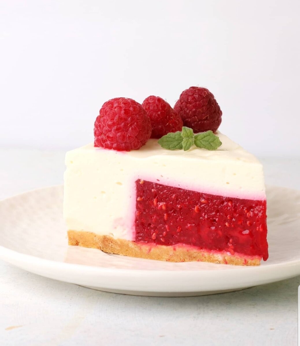 Получился очень вкусный десерт и в меру сладкий. На 100 г: 177 ккал БЖУ: 7/9/17 Основа: 100 г песочного печенья 50 г фруктового пюре ⠀ Сырный слой: 80 г белого шоколада (кстати, можно любой шоколад) 170 г творожного сыра 100 г творога (брикет) 100 г молока 10 г желатина ⠀ Желе из малины: 200 г малины 50 г воды 5 г желатина 1. Малину разморозить и пробить погружным блендером. Если не любите косточки, то можно протереть через сито, но тогда малины больше берите. 2. Желатин предварительно замочить в воде и подогреть до его растворения. Не кипятить. Массу вылить в форму диаметром 10 см. Убрать в холодильник до застывания (у меня ушло 6 часов). 3. Для основы песочное печенье измельчить в крошку в блендере. Смешать крошку с фруктовым пюре. Выложить основу в форму диаметром 16 см. На основу выложить застывшее малиновое желе. 4. Белый шоколад растопить на водяной бане. Желатин предварительно замочить в молоке и подогреть до его растворения. Не кипятить. 5. К шоколаду добавить творог, сыр, мол
