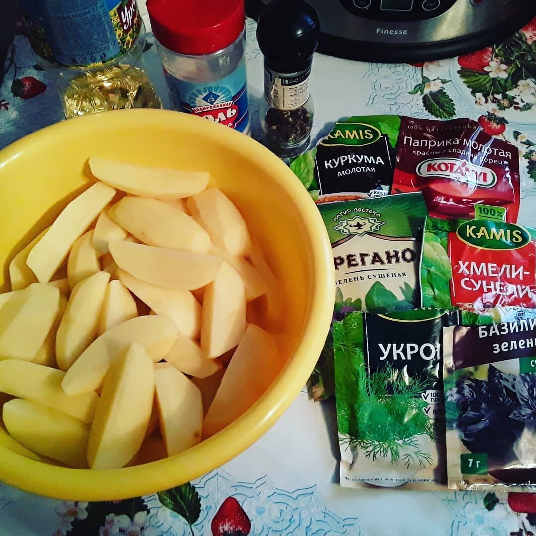 Ингредиенты: 1) Картофель (1 кг) 2) Подсолнечное масло (2 ст.) 3) Соль (1 ч. л. (без горки)) 4) По 1/4 ч.л. хмели-сунели, черный перец, паприка, орегано, куркума, укроп, базелик. Приготовление: Картофель чистим и нарезаем дольками. Добавляем соль, специи, масло. Перемешиваем. Выкладываем на противень, застеленный бумагой для запекания, или как у меня лоток для запекания, очень удобный, не нужно застилать бумагой или смазывать. Запекать при температуре 180-190 градусов минут 40. Приятного аппетита!