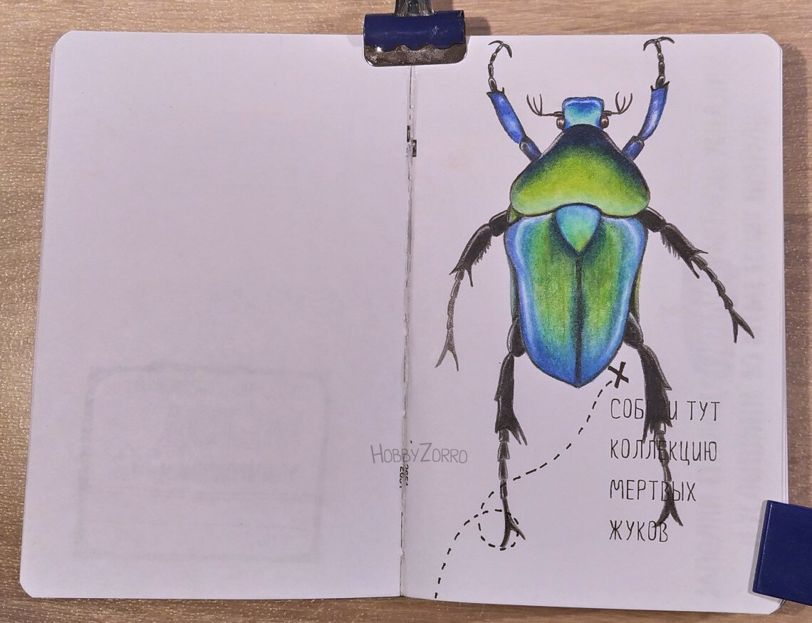 Первая часть заполнения блокнота "Уничтожь меня везде!" (рисование большого жука) можно посмотреть тут