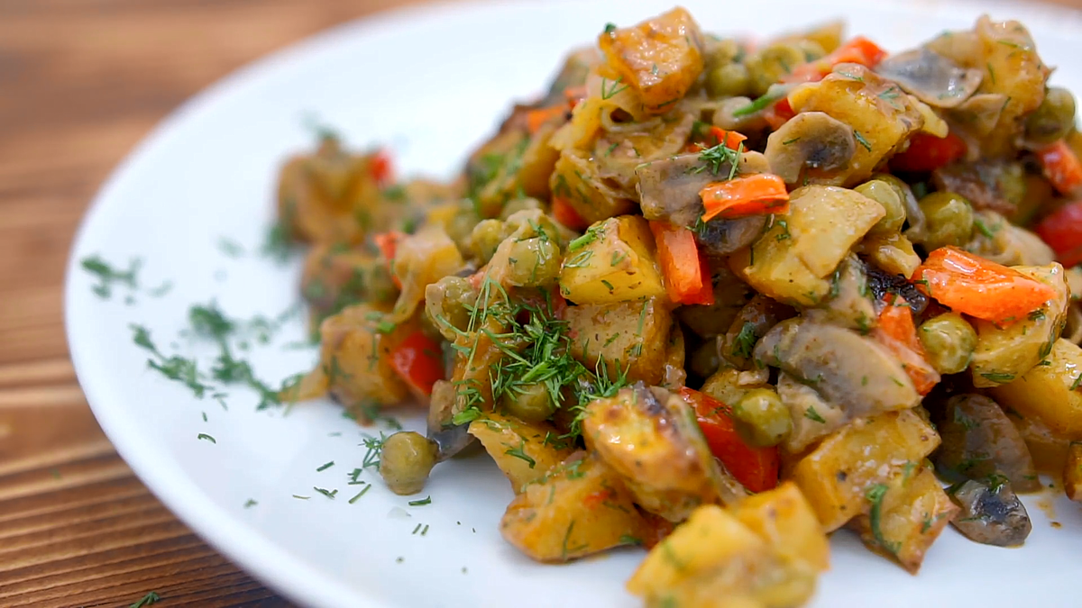 шампиньоны + лук + болгарский перец +зеленый горошек + немного растительного масла + овсяные сливки + запеченная картошка + укроп