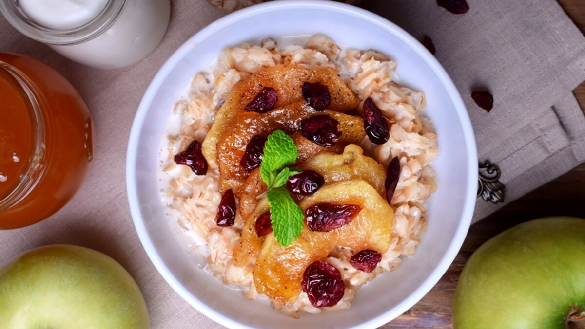 для каши: для топинга: В сотейнике смешать все ингредиенты для каши. Довести до кипения и варить до готовности на малом огне. Яблоки без кожуры и сердцевины нарезать дольками. Обжарить на сливочном масле с одной стороны до румяной корочки, перевернуть и присыпать смесью коричневого сахара и корицы. Когда сахар начнет карамелизироваться, еще раз перевернуть дольки, чтобы покрылись карамелью со всех сторон. Добавить клюкву, через полминуты выключить огонь. Подавать овсянку с топингом горячей. Яблоки нужны твердых сортов, чтобы на сковороде они не превратились в пюре, овсяные хлопья — не быстрого приготовления, а вместо вяленой клюквы подойдет изюм. Приятного аппетита! :)
