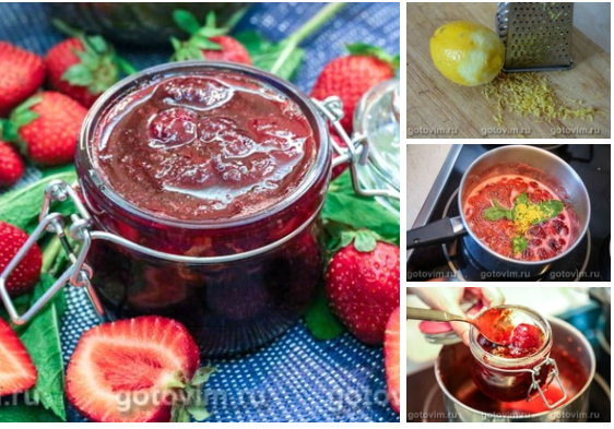 Клубничное варенье станет еще вкуснее, если добавить в него свежую мяту и лимон. Лимонно-мятная свежесть только подчеркнет и усилит аромат клубники. Время варки регулируйте по своему вкусу. По этому рецепту получается в меру густое варенье с почти целыми ягодами. Для рецепта варенья вам потребуется: клубника - 1кг сахар - 800г лимон - 1 шт. (среднего размера) мята - 1 веточка. Рецепт приготовления варенья: Шаг 01 Клубнику перебрать, промыть в чашке с холодной водой, откинуть на дуршлаг и дать обсохнуть. У мытых ягод оторвать чашелистики. Шаг 02 Ягоды положить в кастрюлю для варки варенья, засыпать сахаром и оставить на ночь, пока клубника не пустит сок. Шаг 03 Обычно сока выделяется настолько много, что сахар за ночь успевает почти полностью раствориться. Шаг 04 Лимон вымыть, обтереть досуха бумажным полотенцем и натереть цедру на терке. Затем разрезать лимон пополам и выжать сок. Веточку мяты вымыть, обсушить и оторвать листья. Шаг 05 Когда клубника даст сок, поставить кастрюлю с ягод