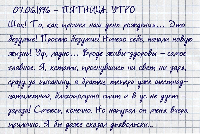 Итак, с чего начать? Да, с утра, конечно, с чего же еще? Так вот, закончил я вчера писать, пошел будить вторую половину, братскую половину. Разбудил. Обнялись, поздравили друг друга. Родители на работе. Четверг. Где им еще быть? Отец конечно не в счет – работает сутками, может и в выходные горбатиться на скорой, а мама – та, пять дней в неделю с девяти до шести, плюс время на дорогу. Короче если отец на сутках, до семи, а то и до полвосьмого мы предоставлены сами себе. Неплохо? Идеально. Но только не вчера. Не в день рождения. Но что поделаешь. Случилось – сидим, разжевываем. Значит так – встали, умылись, оделись, поели… Что дальше? Лето. Каникулы? Ага, щас! Написал же уже, мы пошли в школу с шести, хотя могли спокойно еще год побыть в детстве, в беззаботном детстве. Как и многое, что касается решений наших родителей, для нас и это останется тайной. Видимо, им нравится окружать все связанное с нами некой таинственностью, если несказать секретностью (надеюсь, мы хотя бы их дети, ха-ха