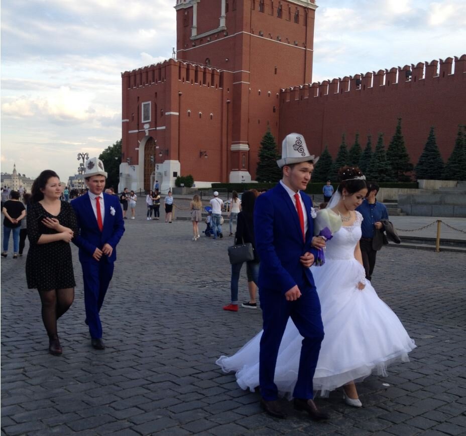 Почти каждую неделю на московских улицах я встречаю свадьбу. Но все реже попадаются традиционные свадьбы коренных жителей городу, но все чаще это необычные празднества представителей различных диаспор. То промчатся джигиты на железных конях с тонированными стеклами, то встретишь в парке толпу в необычных нарядах, то, как на этом фото, молодожены в киргизских колпаках. И это была не единственная киргизская свадьба на Красной площади в этот день. Пока молодые фотографировались на фоне достопримечательностей, я разговорился с одним из гостей свадьбы. Спрашиваю: - Почему свадьбу гуляют в Москве, а не, например, на родине. Там ведь родных больше? Мой собеседник улыбается: - В Москве получается даже дешевле, чем там. Гостей не так много, огромные столы не нужно накрывать, скотину не надо резать. Обычно к свадьбе в Кыргызстане нужно приобрести и заготовить лошадей и другой крупный скот. Кроме того, жениться в Москве считается престижным. На родине все обзавидуются свадебным фотографиям н