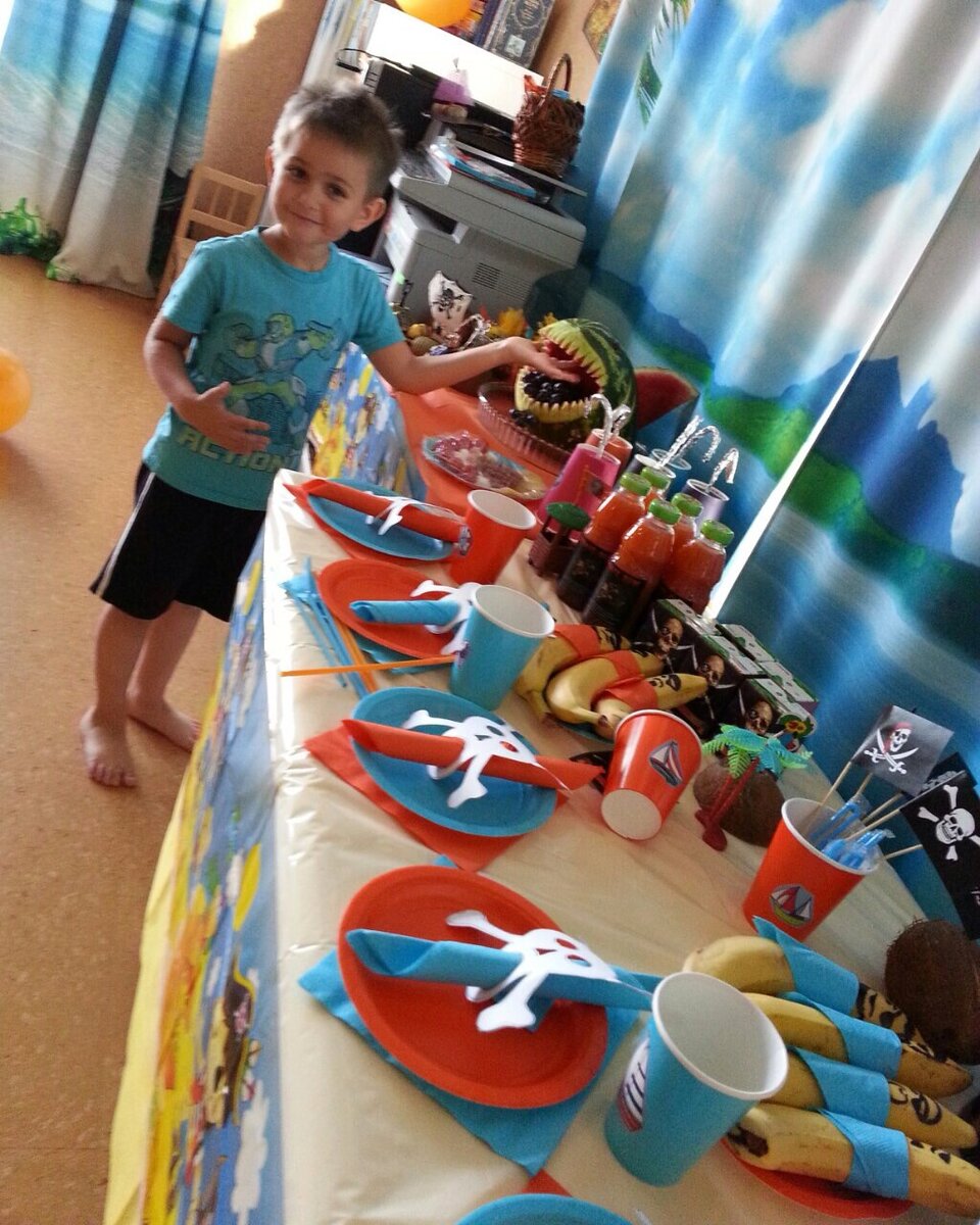 Конечно, же пиратский стол не может обойтись без пиратских напитков, акулы с острыми зубами и праздничной сервировки. Все, что можно сделать заранее - купить скатерть и посуду в теме, вырезать держатели для салфеток в виде черепа, переклеить названия напитков и т.д.