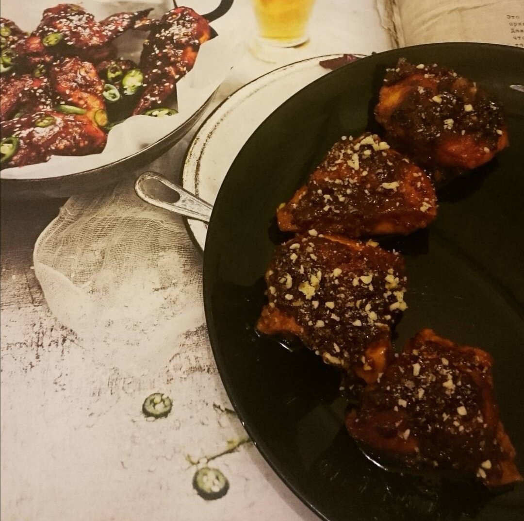 Как и обещала, начинаю делиться своими любимыми рецептами из кулинарных книг, обзор на которые я написала в прошлой публикации. Сегодня будем готовить карамелизированную курицу по рецепту Кэти Куинн Дэвис из книги "На кухне у Кэти". В оригинальном рецепте к Кэти к курице полагается кунжут и перец чили, но рецепт не страдает ни от замены кунжута на грецкий орех, ни от отсутствия чили. Проверено мной. Красную луковку нарезаем кубиками, обжариваем пару минут на оливковом масле, после чего добавляем три зубчика чеснока, раздавленных плоской стороной ножа и измельченных меленько. После (на этом этапе я убрала сковороду с огня) добавляем 250 мл.томатного кетчупа (я добавила 3 ст.л. томатной пасты), 140гр. цельнозерновой горчицы (я положила примерно половину баночки горчицы Kuhne), 120гр. жидкого меда, 2 ст.л. коричневого сахара, 1 ст.л. копченой паприки (давно не дефицит, даже на Озоне можно купить), 1 ч.л. кайенского перца и 3 ст.л. бальзамического уксуса (3 ст.л. соуса ворчестер я проиг