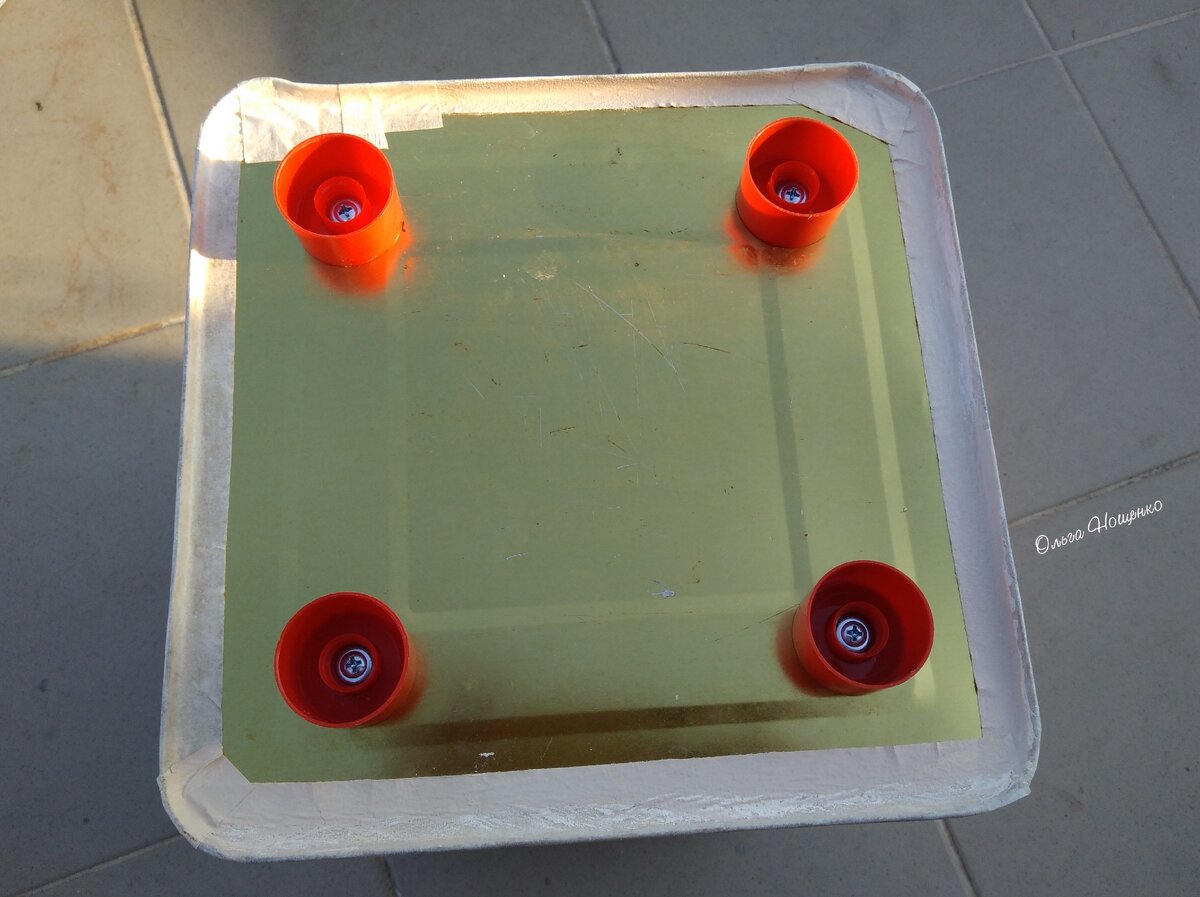 Мой опыт использования кашпо на открытой террасе, подвёл меня к тому, что у кашпо необходимо делать ножки. Иначе, вода подтекает под вазон, долго не сохнет, из-за этого остаются следы на плитке. В качестве ножек, я стала использовать пластиковые крышки. В крышках и в донышке вазона шилом сделала отверстия, а затем просто прикрутила крышки саморезами. Получилось быстро, просто, практично!