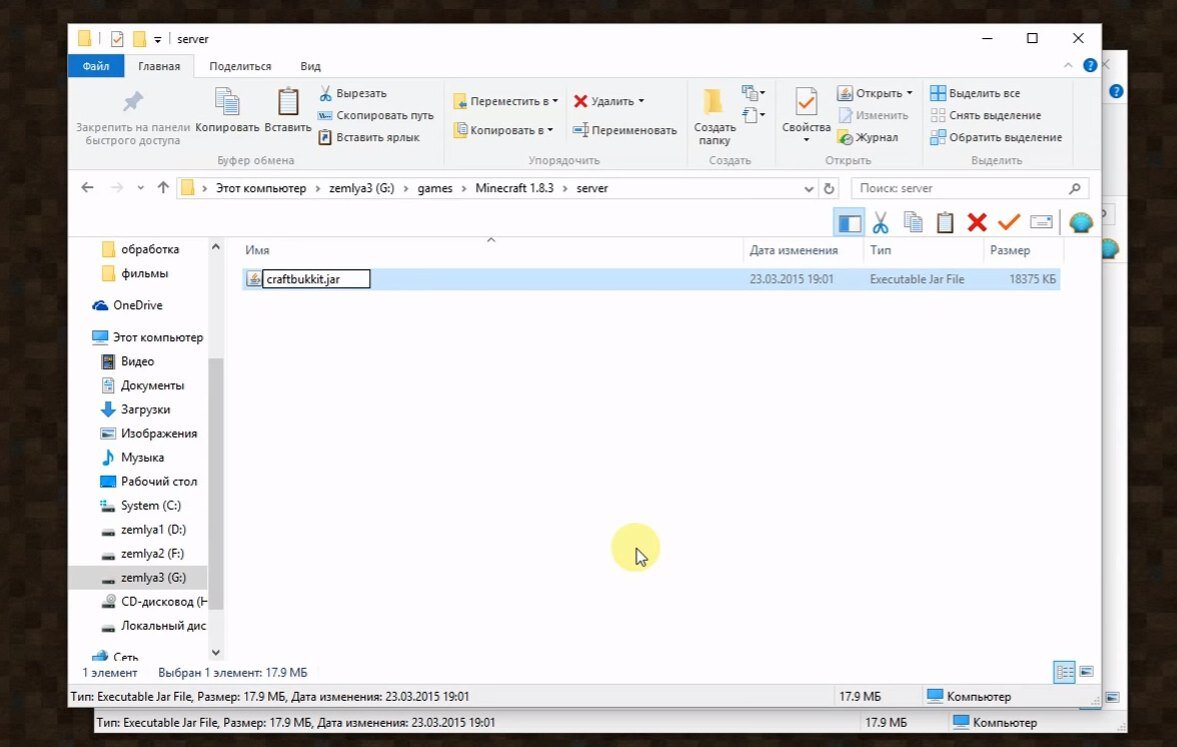 3. В папке с игрой создаем каталог с названием server и перемещаем в него jar файл, который мы ранее распаковали, если у файла длинное название, я бы рекомендовал Вам сократить его, потому как не всегда удобно прописывать в батниках длинные названия, впоследствии легко ошибиться.
