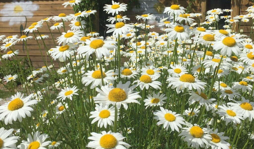 Крупные корзинки с белоснежными лепестками, расцветающие в начале июля, вызывают массу положительных эмоций. Диаметр таких соцветий может достигать 15 см. А вот высота кустов может варьироваться от 100 см до 25 см. Низкорослые сорта хорошо смотрятся при оформлении бордюров.
