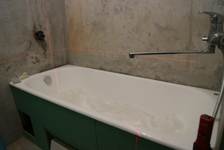 Стена над ванной - самая легкая. Я обычно сразу цепляю стену смесителя, веду параллельно.