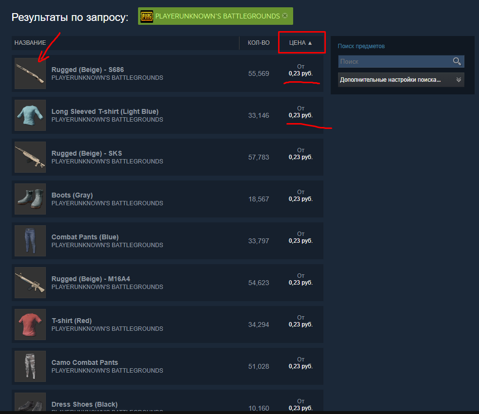 2. Ищем предметы из PUBG сортируем по возрастанию. 3. Переходим на любой предмет. 4. Выставляем автозакуп предмета по цене 0.21 рубля 5. Теперь ждем пока вещи купятся, после попадания в ваш инвентарь ждем еще неделю до выставления на продажу 6. После всех задержек мы снова можем выставить этот предмет на продажу. Цену ставим 0.31 руб Итог: Каждая проданная вещь дает плюс в 7 копеек. Если ваш оборот будет в 100 рублей то получим 133,3 руб.