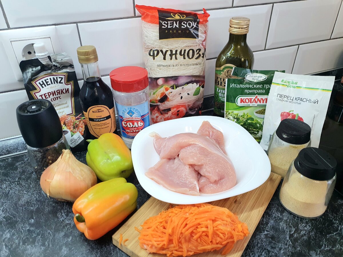 Любите фунчозу? Здесь вы найдете найдёте один из вариантов приготовления! Ни разу не пробовали? Надо попробовать! Фунчоза с индейкой и соусом Терияки - отменное сочетание вкуса. Соус удачно придает пикантный вкус блюду. Стеклянная лапша готовится очень быстро. Как правило её используют для блюд китайской и японской кухни. Представленный вариант - один из простейших, но тем не менее очень вкусный! Нам потребуется: - индейка (или курица)- 500г - болгарский перец- 1 большой или 2 средних - лук - 1 большой - морковь - 1шт. - растительное масло (у меня оливковое) - 20-30г. - перец - по вкусу - чеснок гранулированный - 0.5ч.л - имбирь сушеный - 0,5ч.л. - паприка - 1ч.л. - травы - 1ч.л. - соус терияки - 130г - соль - только если соли из соуса терияки будет недостаточно на ваш вкус. Я делаю без соли. - кунжут и зелёный лук по желанию для сервировки. Порежте лук полукольцами, перец - тонкой соломкой, морковь потрите на тёрке. На разогретую сковороду добавьте оливкового масла, выложите лук, обж