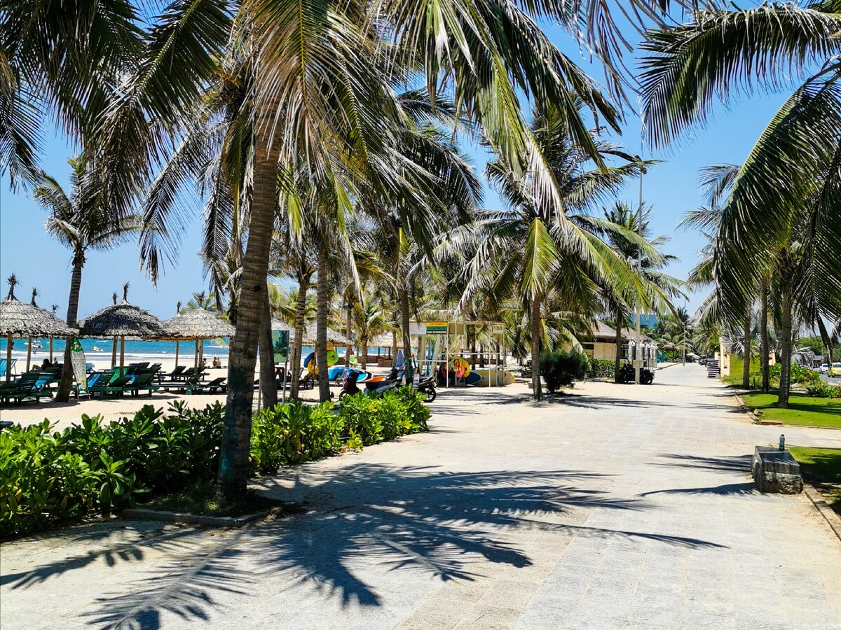 Можно сказать, что пляж берёт своё начало от Леди Будды и заканчивается за городом Хойан. Пляжная линия комфортно обустроена - прогулочная набережная с пальмами, кабинки для переодевания, душевые и ополаскиватели для ног, а также много кафе и закусочных. Пляжные развлечения представлены в достатке -
