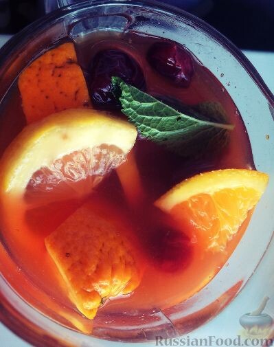 Этот ароматный и насыщенный напиток непременно станет для Вас главной находкой этим летом! Такой чай сочетает в себе пользу и вкус, ведь фрукты - это в первую очередь витамины, а приятный аромат мяты успокаивающе воздействует на организм. Продукты (на 6 порций) Чай (используем любые сорта на Ваш вкус) - 10-15 г Мята свежая - 4 веточки Имбирь (можно как порошковый, так и натуральный) - 5 г Лимон - 1 шт. Апельсины - 2 шт. Мед - 4-5 ст. ложек Вода кипяченая - 1,2 л (из них 600 мл кипятка) *По желанию можно разнообразить напиток ягодами на Ваш вкус: вишня, смородина, клубника и т.д.