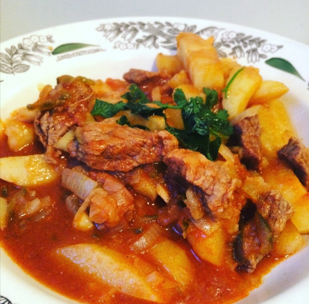 Ингредиенты (1порция) Говядина - 125 г Лук репчатый - 1,5 головки Соленые огурцы - 1 штука Томатная паста - 1 чайная ложка Картофель - 0,2 кг Мясной бульон - 2,5 столовые ложки Чеснок - 1 зубчик Инструкция приготовления 1. Мясо промыть, нарезать соломкой и слегка обжарить в казане в разогретом растительном масле. 2. Добавить порезанный тонкими полукольцами лук и обжаривать мясо с луком до мягкости лука. 3. Добавить томатную пасту, мелко нарезанные или тертые на крупной терке огурцы. Залить водой или бульоном и тушить под крышкой до полной готовности мяса. 4. В отдельной сковороде обжарить нарезанный соломкой картофель. 5. Когда картофель будет почти готов, переложить его в казан с тушеным мясом, добавить, соль, перец, лавровый лист и пропущенный через чеснокодавилку или мелко порезанный чеснок. 6. Осторожно перемешать и тушить картофель с мясом до готовности примерно 5-7 минут.