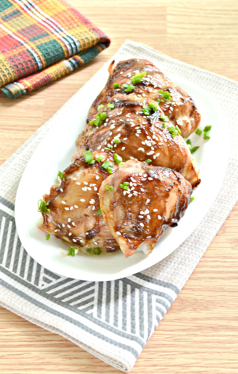 Куриные бёдра с соусом терияки в духовке. Ингредиенты: -бедра куриные - 4 шт. -соус терияки - 100 мл -кунжут - 0,5 ст. л. -лук зеленый - 4-5 пер. -масло растительное - 1 ст. л. Приготовление: Берём охлажденные куриные бедра, снимаем кожуру. Промываем бедра, хорошо обтираем бумажным полотенцем. Форму для запекания смазываем растительным маслом. Выкладываем бедра в форму. Кулинарной кистью смазываем поверхность бёдер соусом терияки. На этом кулинарном этапе используем только половину указанной нормы соуса. Форму с бедрами отправляем в духовку на 25 минут. Достаём форму, смазываем бедра остатком соуса и снова возвращаем в печь на такое же время. Готовые куриные бёдра с соусом терияки присыпаем кунжутом и измельченным зеленым луком. Вкусное аппетитное блюдо из куриных бёдер приготовлено. Приятного вам перекуса!