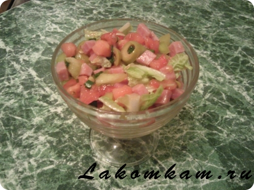 Салат «С ветчиной и сухариками». Ингредиенты: ветчина — 150 грамм; перец болгарский — 1 штука; помидоры — 2 штуки; ржаные сухарики — 50 грамм; оливки — 50 грамм; масло растительное — 3 столовые ложки; горчица — 1 чайная ложка; соль, перец по вкусу; лук зеленый — 1 пучок.