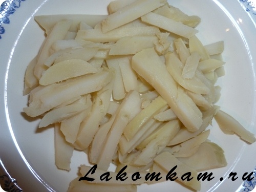 Салат «Пикантный». Приготовление. Картофель отварить, охладить, очистить и нарезать брусочками.