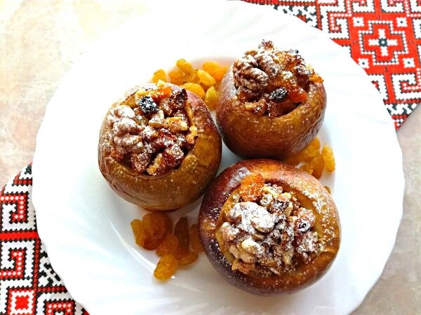 Яблоки, запеченные в духовке с медом, орехами, изюмом и курагой, сдобренные корицей – это сочный, ароматный десерт, который по-настоящему радует любителей сладкого, желающих есть здоровые полезные продукты. Нежные фрукты, наполненные смесью из грецких орехов, кураги и изюма, приправленные ванилью и корицей – на вкус это невероятно хорошо! Плюс, во время выпечки ваш дом наполнится восхитительным запахом уюта и комфорта.