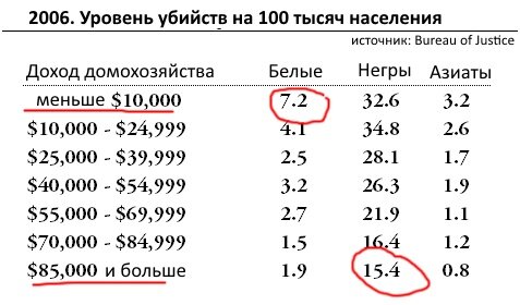 Табличка по уровню убийств показывает, что самая богатая группа негров всё равно совершает вдвое (!) больше убийств, чем самая бедная группа белых: