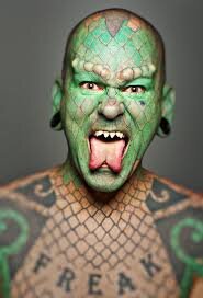 Эрик Спрэг, известный как «Ящер», является американским уродцем и второстепенным исполнителем. Он наиболее известен своими модификациями тела, в том числе заостренными зубами, татуировкой всего тела с зелеными чешуйками, раздвоенным языком, подкожными имплантатами и зелеными губами. Родился 12 июня 1972 г. (возраст 48 лет).