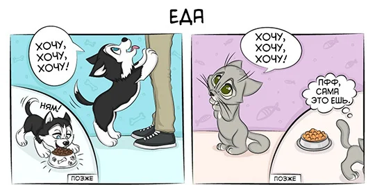 Приветствую тебя, дорогой друг! Кошки и собаки тоже самое, что Инь и Янь! Вроде одинаковые, но в тоже время такие разные. И ,кстати, их хозяева также очень сильно отличаются друг от друга характером, поведением и даже манерой разговора. Люди с повышенной активностью предпочитают заводить собак, чтобы как можно больше проводить со своим пушистым другом на улице, а домоседы в свою очередь большее предпочтение отдают кошкам, ведь смотреть любимую телепередачу без этого пушистого комочка - совсем не то! И иногда создается такое впечатление, что все эти люди живут на двух разных планетах - одни стоят стеной за собак, оправдываясь тем, что собака - это лучший друг человека и то, что кошка даже не тянет на звание - домашний питомец, а вторые наоборот, отчаянно защищают кошек и не любят собак. А вот одна художница по имени Астхик Рахимова из BrightSide вообще не видит разницы между кошкой и собакой, и одинаково ценит и любит этих питомцев. И однажды ей в голову пришла идея нарисовать несколько