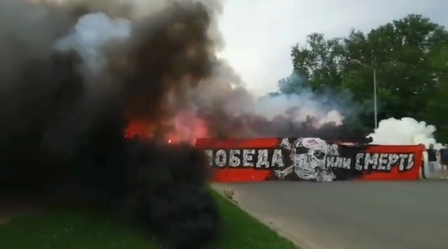 День добрый,дорогие читатели. Вчера возобновился розыгрыш Российской премьер-лиги. Сегодня же,20 июня,должен состоятся матч Арсенал (Тула)- Спартак (Москва). Перед отъездом "красно-белых" в Тулу,их фанаты решили провести проводы команды. Как видно из фотографий,болельщики Спартака перекрыли банером объездную дорогу вокруг стадиона "Открытие-Арена". Не обошлось и без файеров. Но всё это продолжалось считанные минуты,никто в ходе этой акции не пострадал, и движение автотранспорта не было затруднено. Тем не менее, сегодня стало известно,что было заведено уголовное дело на болельщиков московского Спартака,принимавших участие в данной акции. — Следственной частью Следственного управления УВД по Северо-Западному административному округу ГУ МВД России по Москве возбуждено уголовное дело по признакам преступления предусмотренного ст. 213 УК РФ (хулиганство), — говорится в сообщении пресс-службы управления. — Проводятся мероприятия по розыску лиц, причастных к противоправному деянию. 19 июня 20
