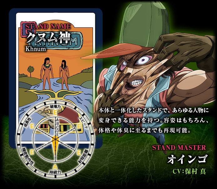 Khnum — стенд Оинго, показанный в «Крестоносцах звёздной пыли». Стенд, даёт возможность своему пользователю изменять лицо, рост, вес, запах и предположительно голос, как тот считает нужным.