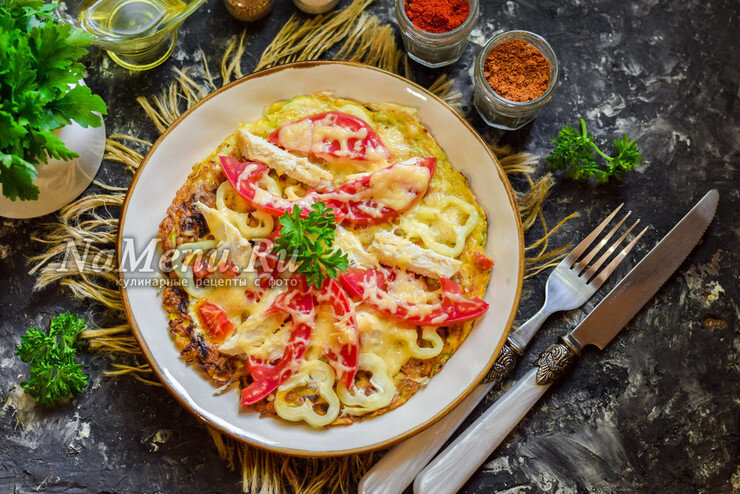Ингредиенты: 💦Молодой кабачок ополоснуть и натереть на мелкой терке. Если кабачок слишком водянистый, отжать жидкость. Переложить стружку кабачка в миску 🥚Добавить яйцо и муку, перемешать все компоненты. Добавить соль и перец, сухой чеснок, перемешать повторно 🍅Нарезать вареное куриное филе небольшими кусочками, помидор сполоснуть и нарезать кружочками, перец нарезать круглыми заготовками 🔥Сковороду прогреть, выложить все кабачковое тесто и разровнять. Жарить 3-4 минуты на небольшом огне, перевернуть, смазать ложкой сметаны 🧀Выложить поверх перец, помидоры и курицу, тертый сыр 🕒Готовить пиццу под крышкой еще 5 минут на маленьком огне https://namenu.ru/11738/PP-picca_na_skovorode_za_10_minut/