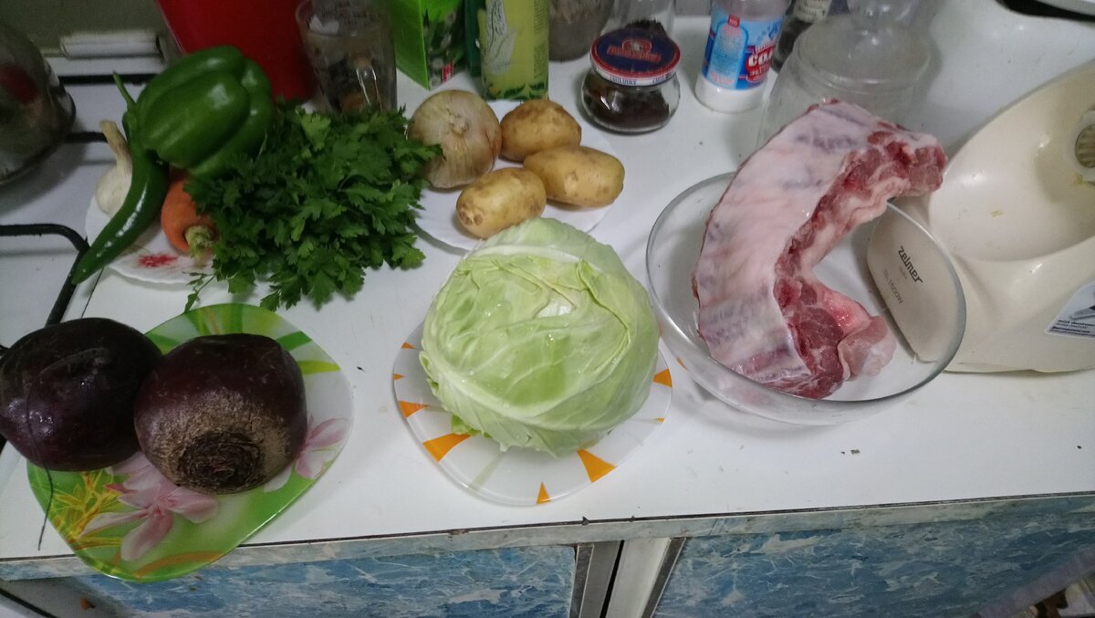 Добрый день! Попробовавшие этот борщ всегда спрашивают почему он настолько вкуснее обычного, секрет в конце статьи ))) Итак предоставляю свой рецепт на ваш суд: Для приготовления 5 литров борща понадобится: примерно 250 грамм картофеля ( 2 средних картофелины или 3 маленьких) 2 крупных свеклы 1 средняя морковка пучек зелени (это может быть укроп , петрушка , киндза или их смесь) средняя головка лука головка чеснока 1 болгарский перец. 1 горький 800 г капусты 800 г свиных или говяжих ребрышек чуть не забыл, 2 помидора Приготовление: Режем мясо на крупные кусочки ( приятно же , когда в тарелке борща большой кусок мяса))) Обжариваем мясо на сильном огне с чайной ложкой сливочного масла Борщ с обжаренным мясом вкуснее , кроме этого не будет пены при закипании , а собирать ее то еще удовольствие Степень обжарки сфотографировал Перекладываем мясо в кастрюлю Чистим и режем картофель , нарезаю на насадке на мясорубку, очень удобно Немного обжариваем с чайной ложкой сливочного мас