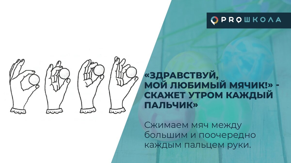 Данные упражнения можно использовать как физкультминутку на уроках письма (во время выполнения домашней работы), и как игры с свободное время. Массаж пальцев очень полезен, ведь на их кончиках сосредоточены активные точки, которые являются проекцией внутренних органов. При занятиях с ребенком можно и нужно проговаривать - это и превращает занятие в игру, и помогает запомнить упражнения. Следующее упражнение немного посложнее, так как требует определенной координации движений. А в "футбол" можно играть и одному, и с напарником. Во втором случае располагаться нужно рядом, маленького ребенка можно посадить на колени и играть "в четыре руки". Для следующего упражнения нужно подобрать мячик более маленького размера, ориентируясь на возраст ребенка - фактически, на размер его ладошки. Для упражнения на сжатие значение имеет не размер мячика