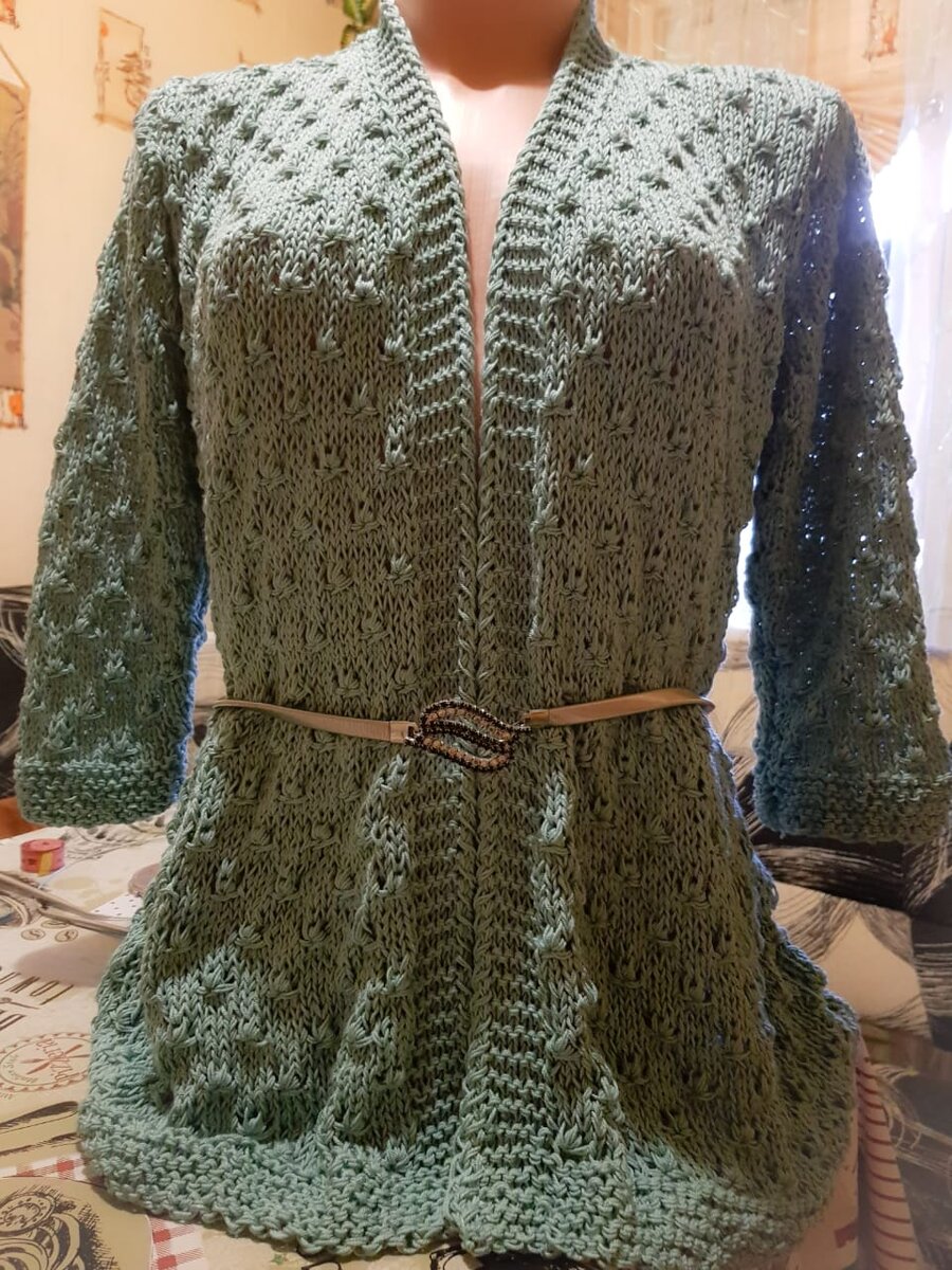 Женский летний жакет без застежки. Рукав 3/4 Вязала в две нити спицами №6. Рапорт узора 3 петли + 3 петли для симметрии. Спинка: Набираем на спицы для 38 размера 84+3+2 кр.п. (на 36 размер 78 +3+2 кр. На сороковой размер 93+3+2 кр.) Провязываем 5 см платочной вязки (9 рядов) и переходим на основной узор. Провязываем в высоту 50 см (5 см + 45 см основным узором). Для проймы закрываем 4;3;3;2 п.(для 36 размера 4;3;3;2 п. для 40 размера 6;3;3п) и провязываем еще 20 см. На высоте 70 см петли закрыть. Рукав: 3/4 Набираем 41 п. (36+3+2 кр.п.) (36 размер все так же); (40 размер 36+3+2кр) 5 см платочной вязки. Переходим на основной узор и делаем +1 п. прибавки с обеих сторон; 3 ряда по рисунку; повторять 10 раз; 7 рядов по рисунку; 1 прибавка; 3 ряда по рисунку. Для оката рукава закрыть по 4;3;3;2 п. с обеих сторон; 1 п. закрыть; 1 ряд по рисунку; 3п;4п. (Для 40 размера закрыть 6;3;3 ) Полочка: 42п+3+2кв.+7п планка (54п) на 36 размер - 36 петель + 3 +2 +7 планка; на 40 размер 42 +3+2+-7