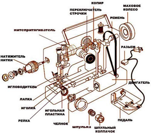 Швейная машина – это специальный механизм для прокладывания строчек и сшивания тканей между собой. Но есть ли какие-то обязательные составляющие этого устройства? Известно, что швейная машина должна проколоть иглой ткань, провести сквозь неё нить, перевести нитку иглы с нижней ниткой, затянуть нитки в стежок и переместить ткань на определенный шаг, причем, все эти этапы должны быть выполнены машиной многократно. Получается, что в швейной машинке обязательно должен быть механизм иглы, механизм переплетения ниток (петлитель или челнок), механизм подачи нитей и механизм перемещения материала.